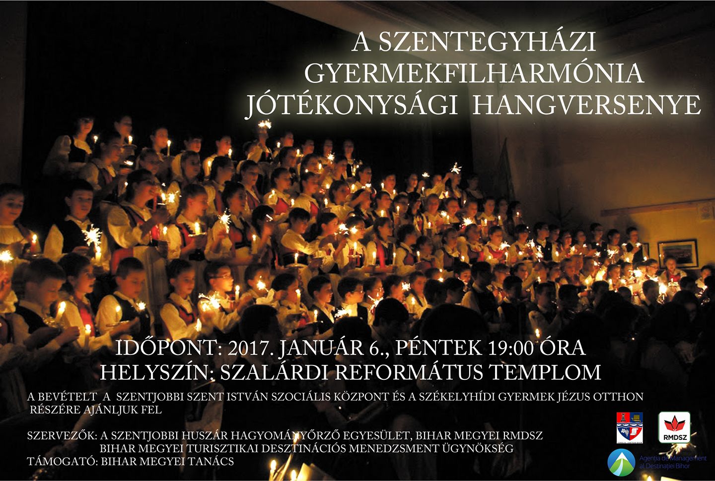 A Szentegyházi Gyermekfilharmónia 2017. január 6-án 19:00 órakor a szalárdi református templomban jótékonysági hangversenyt ad, a bevételt a szervezők a Szentjobbi Szent István Szociális Központ és a Székelyhídi Gyermek Jézus Otthon részére ajánlják fel.