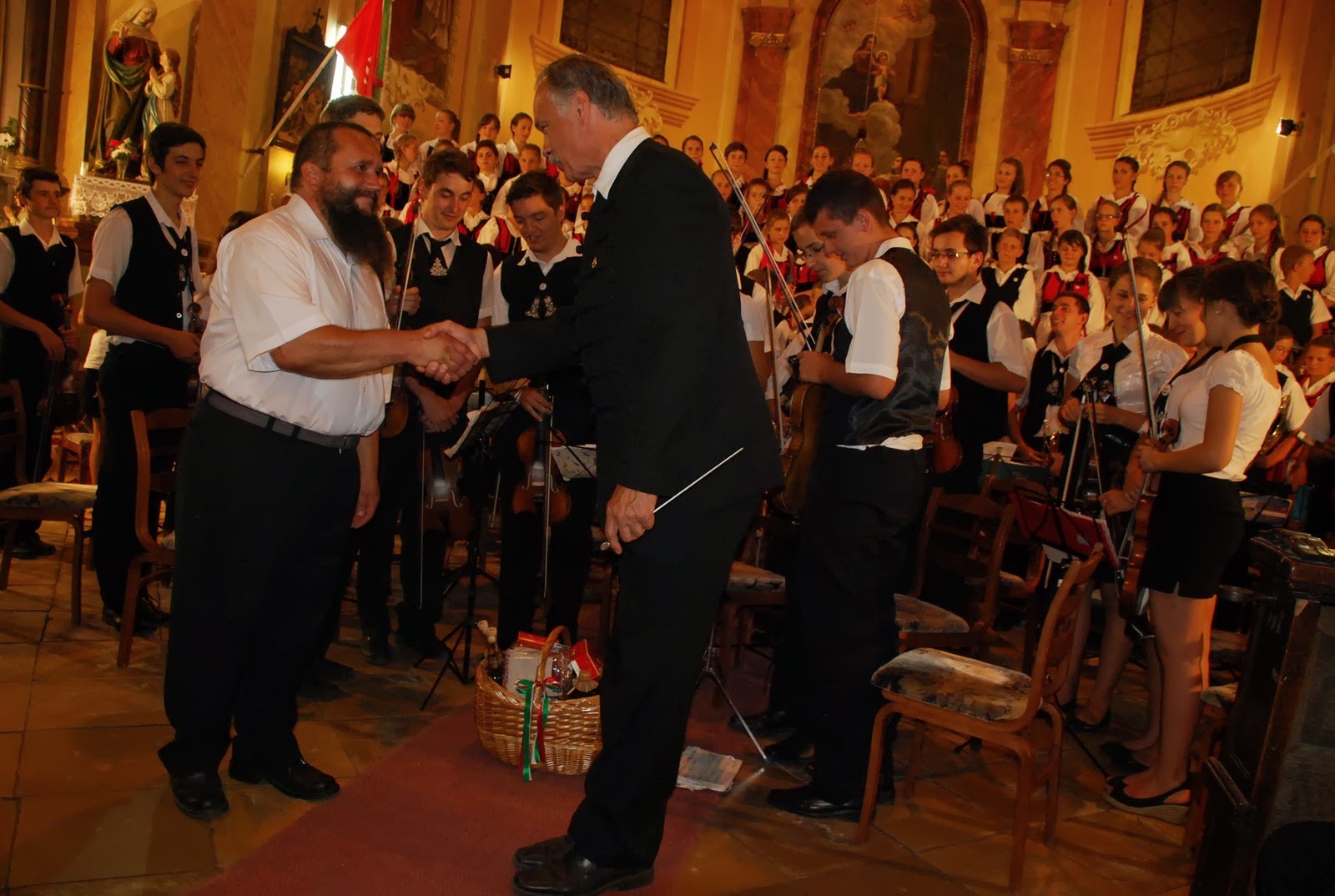 Strand utan gyors csipegetes, szekelyruha es irany az endrodi templom, ahol ket es fel eve szerepeltunk meg. A plebanos ur tudja a templom berendezesenek modjat. Minden elokeszitve, pillanatok alatt epitkezunk. A korus ma ulni fog, a dunaalmasi deszkak nelkul ez nehezen lett volna kivitelezheto. A megoldas sikeres, a latvany pompas: uj talalmanyunk, a Piave indulora valo hullamozo felallas rendszere. Nemcsak az enekesek, a kozonseg is dijazza ezt a latvanyt. Huszadikai eloadasunk egyik fenypontja a negy nepdal szolista parosanak kivonulasa ? Ambrus Adam es Szelyes Boroka.