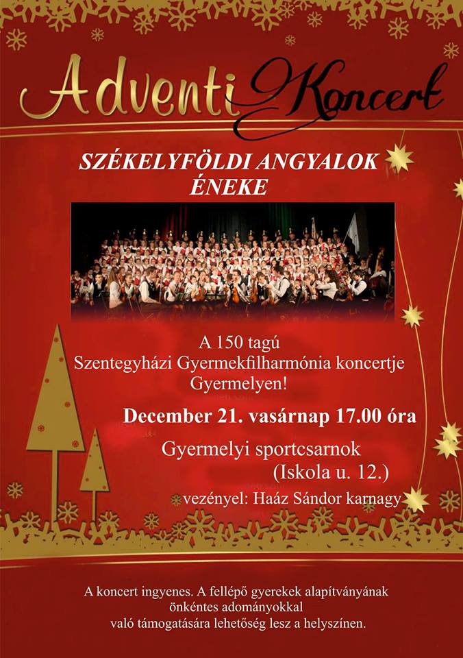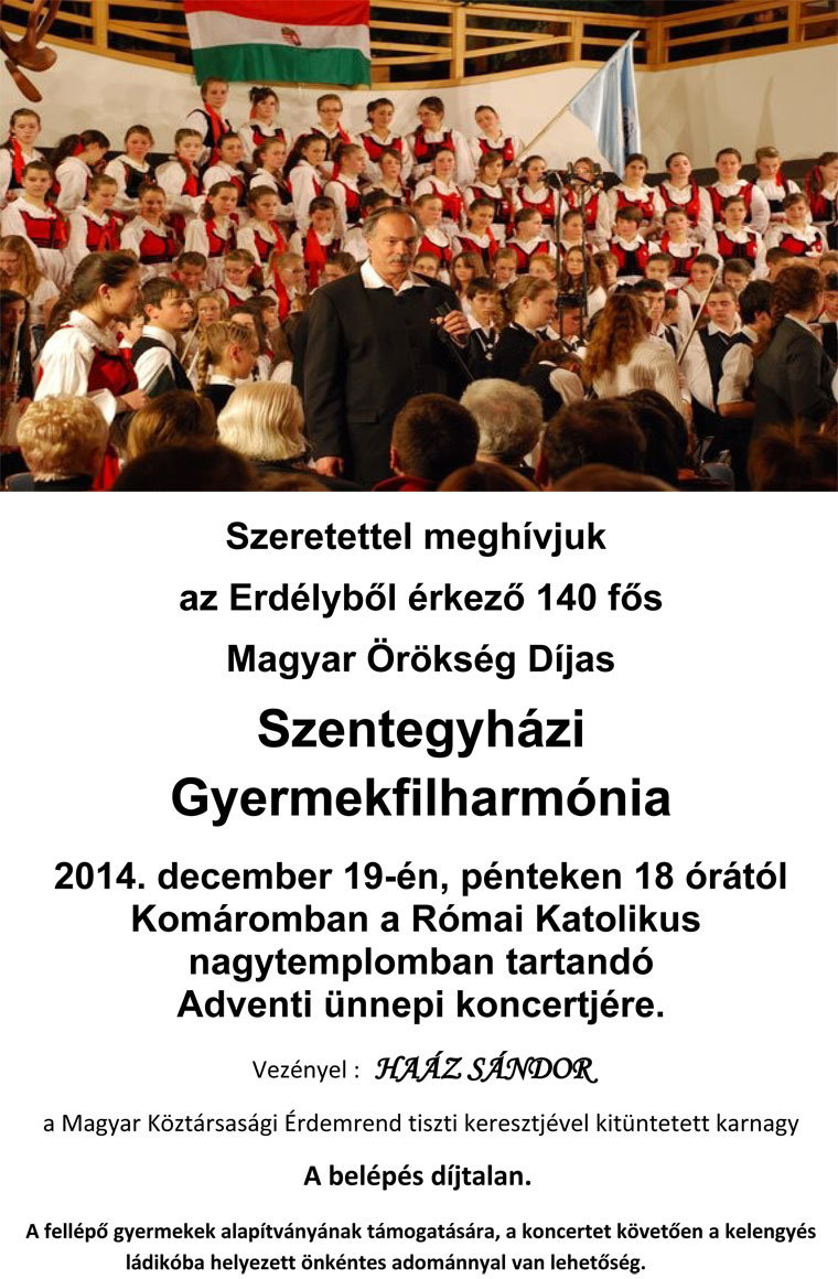 A Szentegyhazi Gyermekfilharmonia magyarorszagi adventi korutjat iden december 18-22. kozott tartja. A A 145 fos enek- es zenekarral erkezo Fili Kapolnasfalun, Komaromban, Szekesfehervaron, Gyermelyen es a Nemzeti Kozszolgalati Egyetem (Ludovika) kapolnajaban ad karacsonyi hangversenyt.