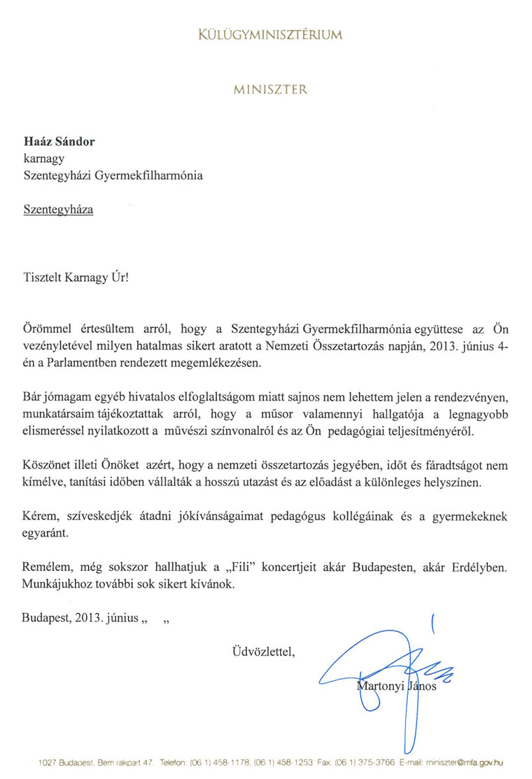 Dr. Martonyi Janos kulugyminiszter levelben koszonte meg Haaz Sandor karnagynak a Szentegyhazi Gyermekfilharmonia sikeres fellepeset a Nemzeti Osszetartozas Napjan, 2013. junius 4-en a Parlamentben rendezett megemlekezesen.