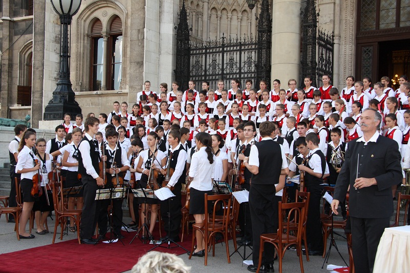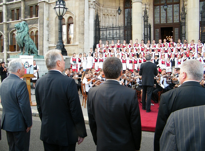 A Gyermekfilharmonia hangja betoltotte a Kossuth teret, es egyre tobb jarokelot kesztetett arra, hogy megalljon, es belefelejtkezzen a nem mindennapi latvanyba. Mert ez a koncert maga volt a csoda: 140 szekely ruhaba oltozott gyermek a tortenelmi Magyarorszag 4 reszenek (Magyarorszag, Felvidek, Karpatalja, Vajdasag) 2-2 nepviseletbe oltozott kepviselojevel karoltve a Parlament folepcsojen enekli a magyar es szekely himnuszt a Magyar Koztarsasag elnokevel egyutt. A Fili jovore lesz 30 eves es most jott el ez a felemelo pillanat, a Parlament lepcsojen a Karpat-medence osszmagyarsagat a Gyermekfilharmonia testesitette meg. Holnaptol pedig Europa nagyvarosaiban es csucspontkent az Europa Parlamentben kepviseli a magyar es szekely kulturat.